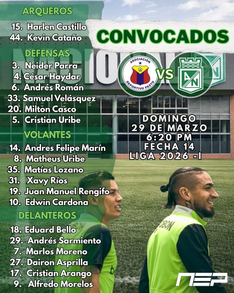 Con 4 bajas importantes (Ospina, Tesillo, Campuzano, Rodríguez) y con el regreso de Cristian «Chicho» Arango, Atlético Nacional ya está en Pasto, concentrado y listo para enfrentar este domingo (6:20 p.m.) al Deportivo Pasto en el el estadio La Libertad. El partido se jugará en cumplimiento de la fecha 14 de la Liga 2026-I del FPC.