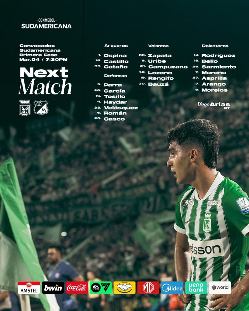 **La ausencia de Edwin Cardona, por suspensión de Conmebol (Vs Sao Paulo 2025), y el regreso de William Tesillo, principales novedades en la convocatoria del verde.