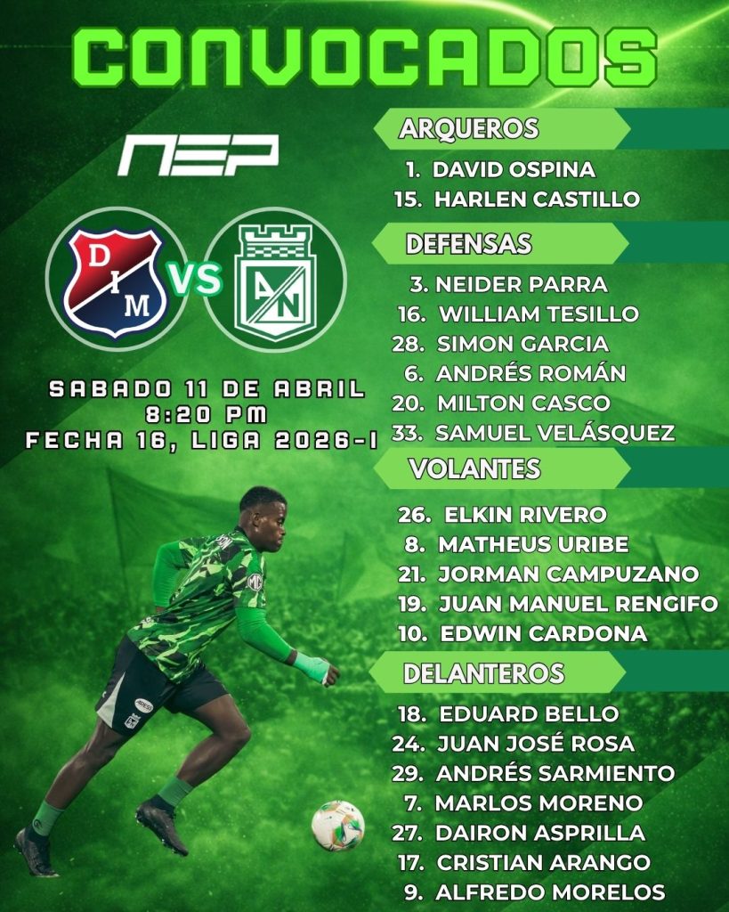 Atlético Nacional será visitante ante el Independiente Medellín, en otra versión más del Clásico Paisa. El partido se jugará esta noche (8:20 p.m.) en el estadio Atanasio Girardot y en cumplimiento de la fecha 16 de la Liga 2026-I del FPC.